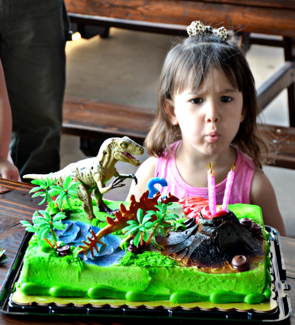 You are welcome to bring your own dessert for the party. The jungle themed cake we picked up from our local Fry’s grocery store bakery was perfect with the addition of a few of little sister’s dinosaur toys from home.