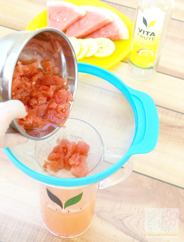 3) Pour muddled watermelon into pitcher of VitaFrute Lemonade over strainer to avoid dropping seeds and watermelon chunks into drink.
