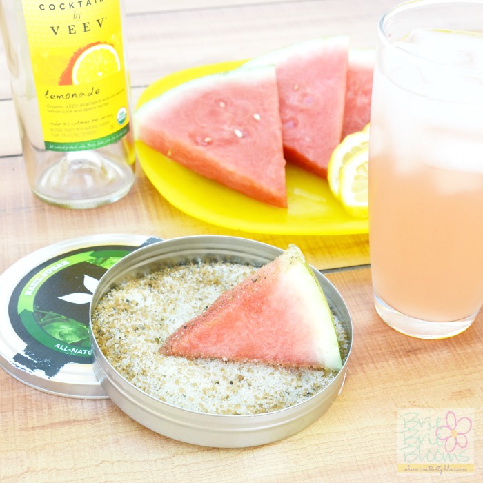 6) Garnish individual glasses with a watermelon slice coated in VEEV basil sugar rim.