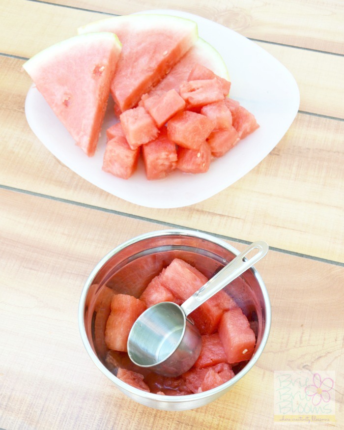 2) Cut watermelon into small cubes and muddle. If you don’t have a muddling tool, simply use the back of a small metal measuring cup to press fruit into bottom of a metal bowl.
