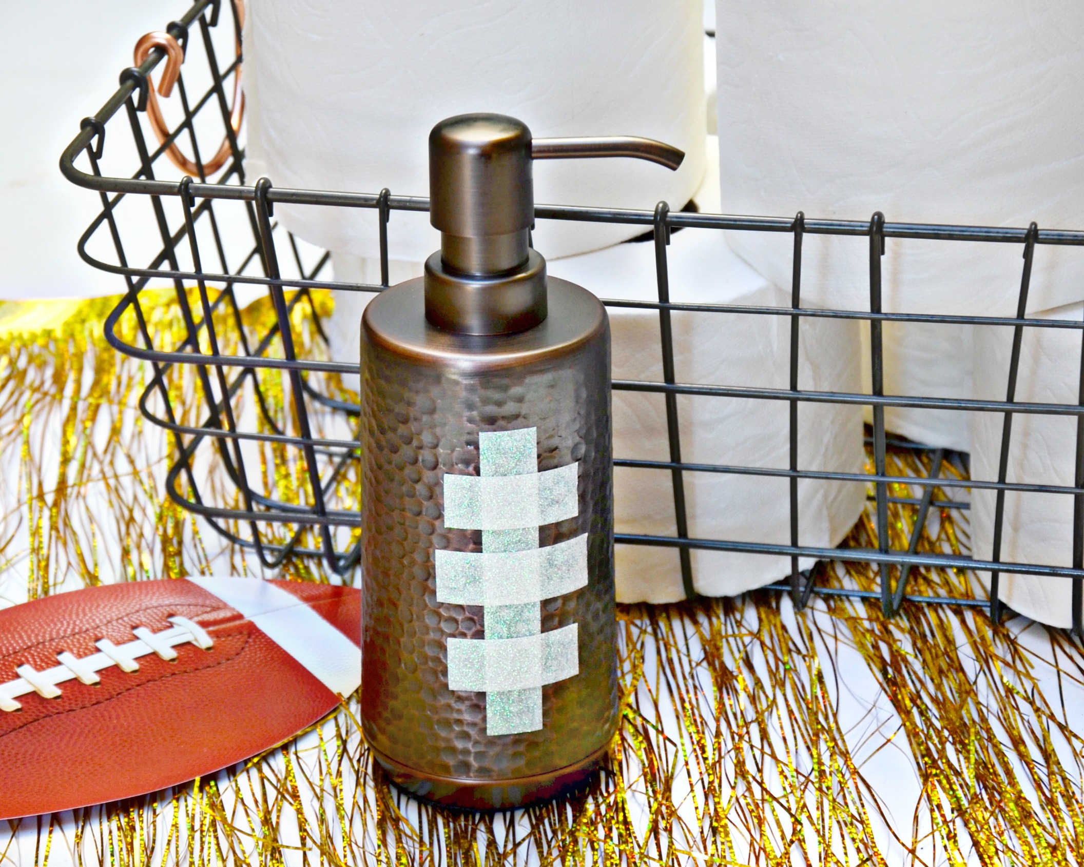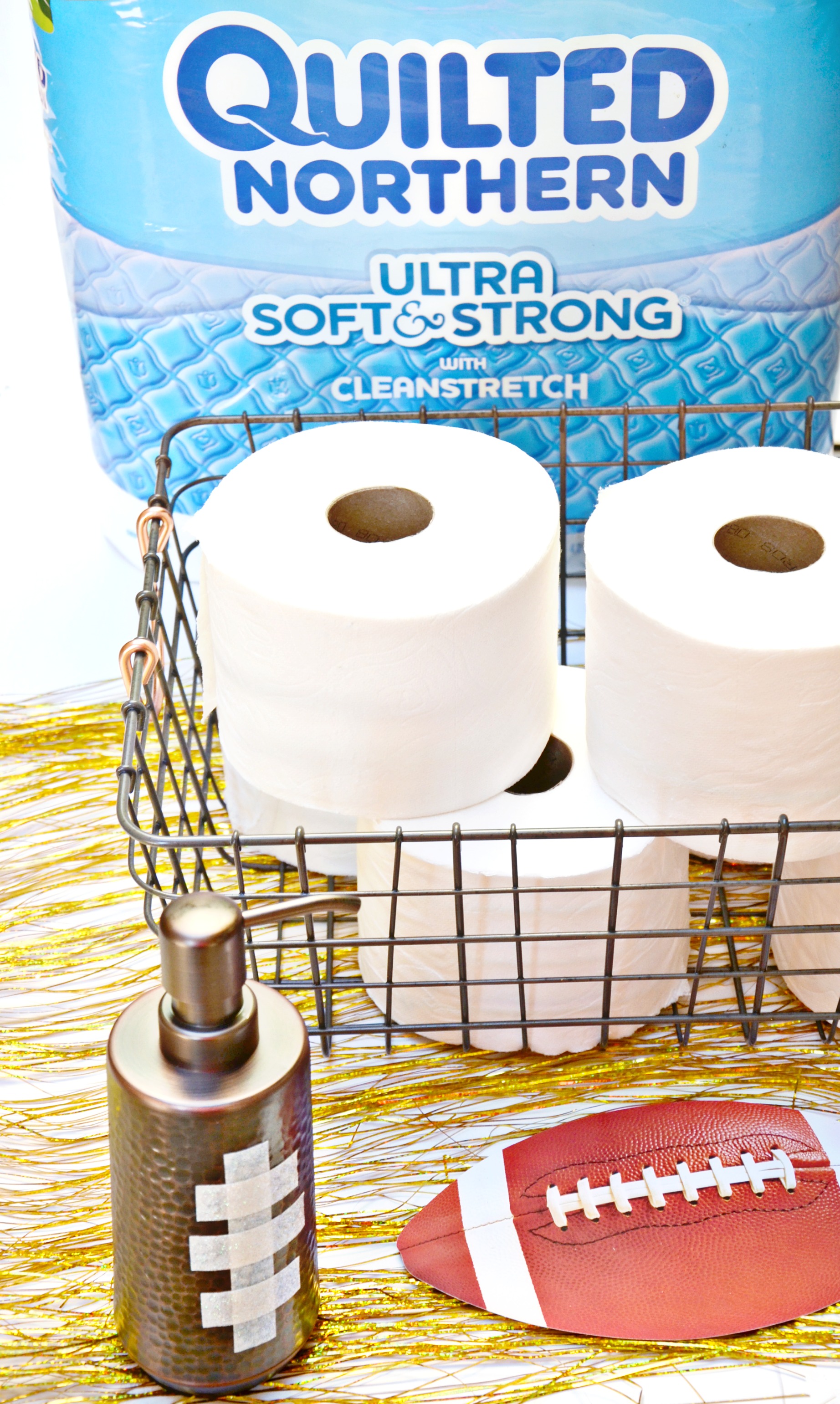 We’re having fun prepping for a Mega Game party and decorating with simple decorations that will make a big impact this week. The washi tape football soap dispenser is the quickest craft and a great way to dress up your guest bathroom for the party. We’ve also stocked the bathroom with Quilted Northern Ultra Soft & Strong® Mega Rolls from Target to be ready for guests. The Mega Rolls are 4 regular rolls in one – so they last longer and you can change the roll less often than before. We won’t be spending any time changing rolls during the Big Game!