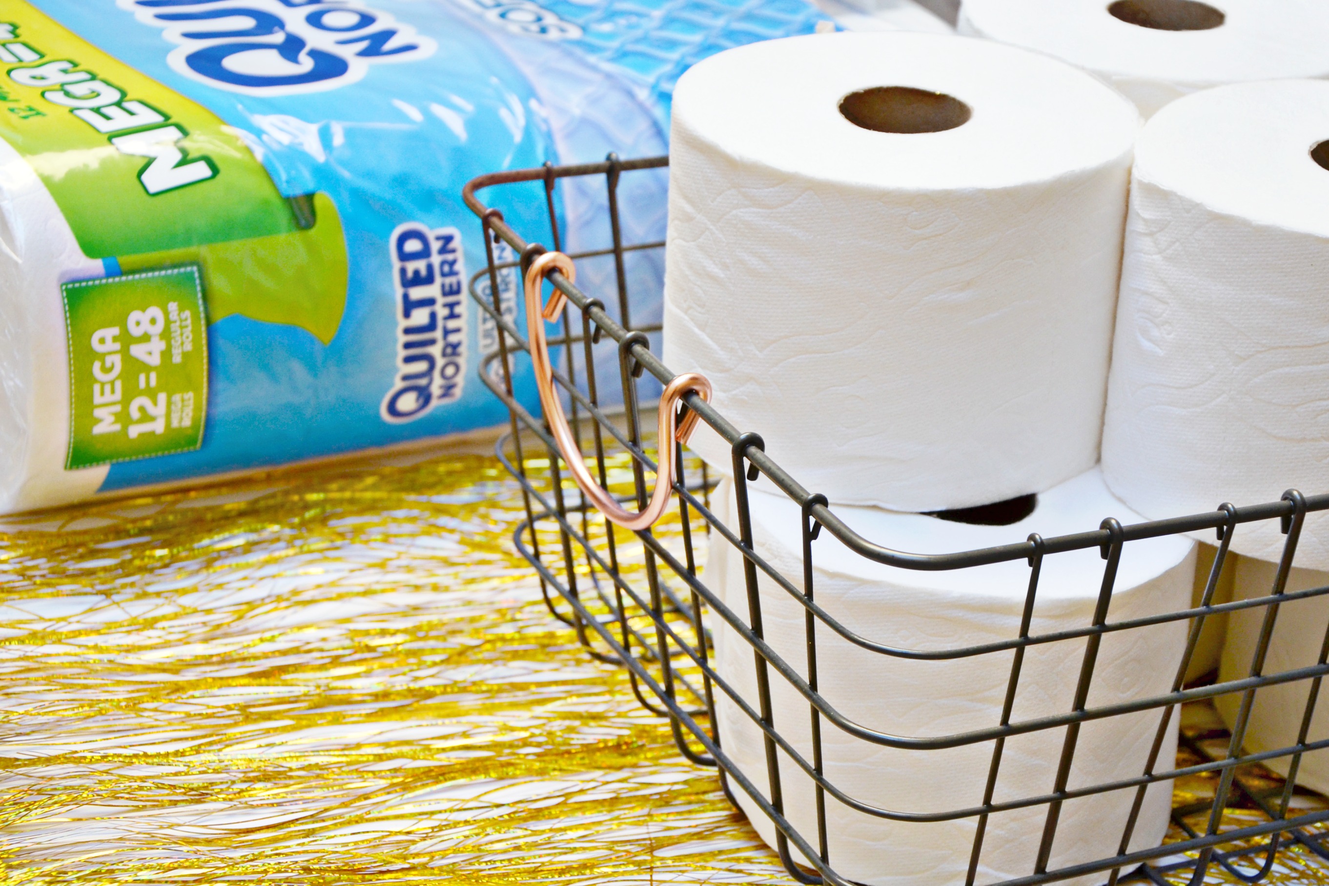 Stock your guest bathroom with Quilted Northern so you won’t spend any of your party refilling bath tissue rolls. A metal basket with copper handle adds a nice touch to the bathroom and matches the soap dispenser.