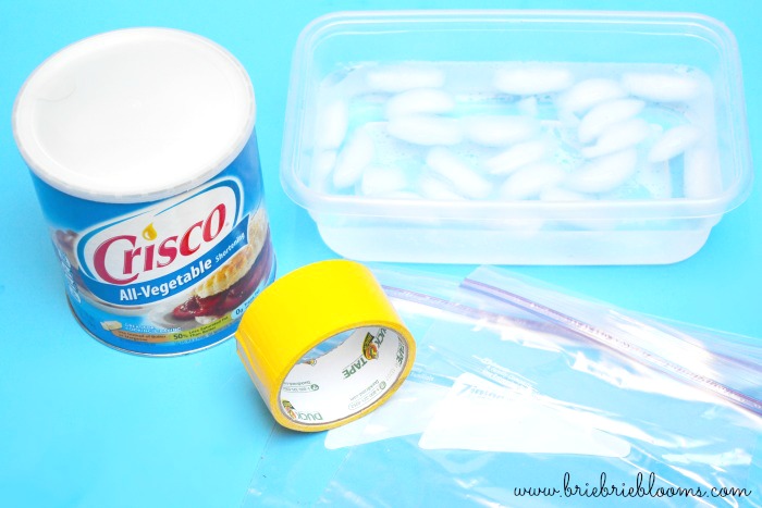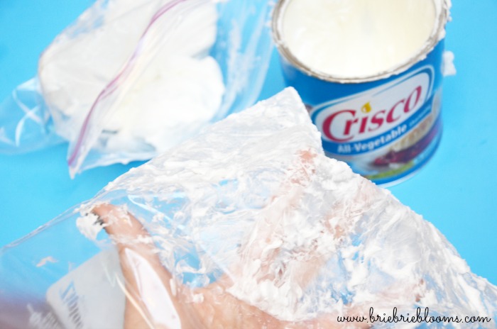 Use one of the Ziploc bags as a glove to fill the other bag about a quarter full with shortening.