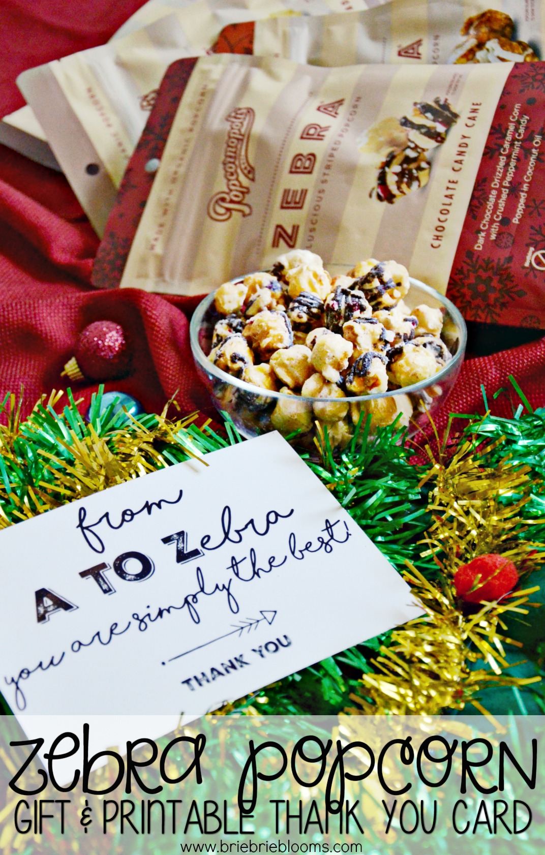 The yummy seasonal Zebra® popcorn makes an excellent holiday gift for many different people – delivery drivers, school employees, teachers, your favorite postal workers and so many more friendly faces you see on a daily basis but don’t get told enough how they make a positive difference for so many. My Zebra Popcorn printable thank you card can easily be printed from your home computer to create an entire box of the popcorn gifts to have on hand this holiday season. Go ahead and thank me for not adding color to the card so you don’t need to run out and refill your ink cartridge. But you could easily use a glue stick to adhere the printable card to a festive background if you really need that pop of color.